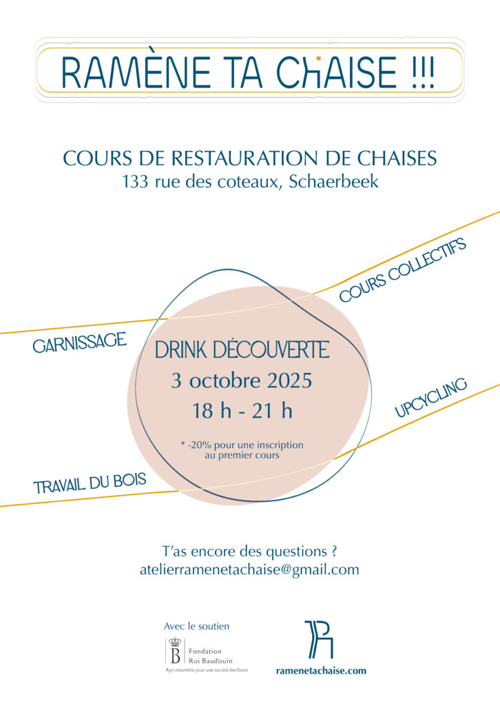 Tu auras la possibilité de mettre la main à la pâte, d’acquérir de nouvelles compétences et surtout l’immense satisfaction d’avoir restauré toi même ta chaise (et de pouvoir reproduire l’expérience chez toi) le tout dans une ambiance conviviale et bienveillante.