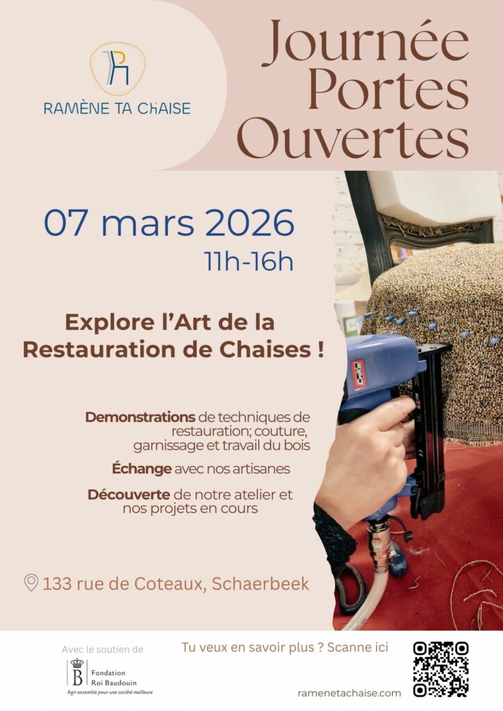T’as toujours rêvé de savoir comment redonner un coup de jeune à une vieille chaise ? Viens à nos Portes Ouvertes le 7 mars, de 11h à 16h, 133 Rue de Coteaux, Schaerbeek !